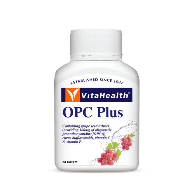 VitaHealth OPC Plus contains grape seed extract standardised to 95% oligomeric proanthocyanidins (OPCs) and a blend of antioxidants – citrus bioflavonoids, vitamins C and E.
